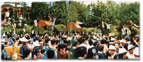 ・だんじりの到着時刻に近くなると、参道入口から大鳥居にかけて人の波まで埋まってしまう。人ごみをかき分けながら、だんじりが10分おきに1台ずつ境内広場を目指して進んでいく。威勢のよいかけ声、胴長太鼓・締太鼓・鐘・鼓の勇ましい響き、篠笛の音色が通り過ぎていく。曲は信楽囃子。大鳥居を通り抜けると、坂道。斜面は約16度。綱をもつ引き子の手に力がこもる。指図する大人の声も次第に大きくなってくる。祭りばやしはひときわ賑やかに。